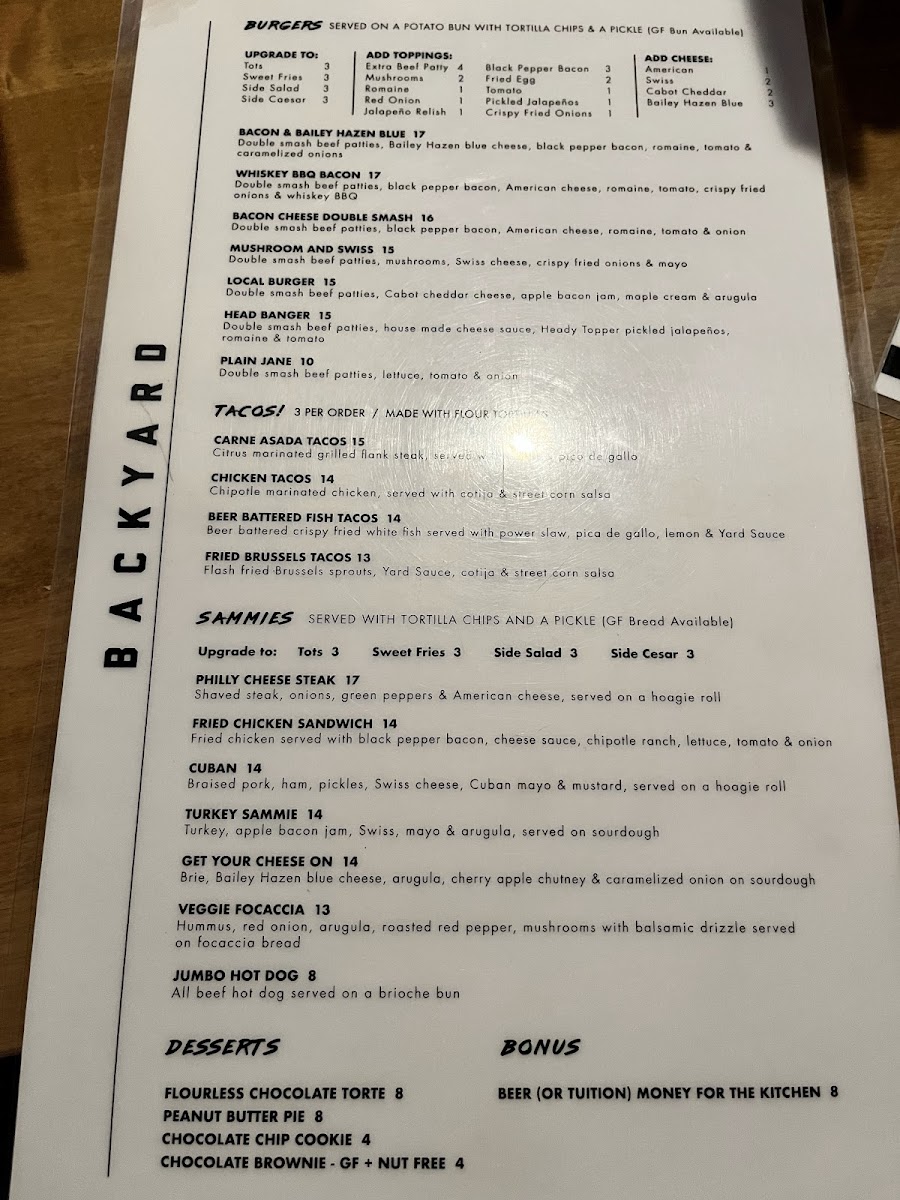 The kids' menu ensures even the littlest diners are catered for, featuring favorites like the Kids Burger and Hot Dog. Guests rave about the fantastic service, making it not just a meal but a memorable experience. Whether you're craving something indulgent or simply looking for a relaxing bite, Backyard - Stowe is a must-visit culinary gem.